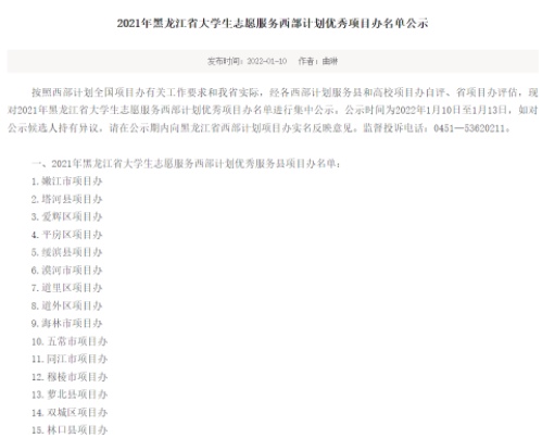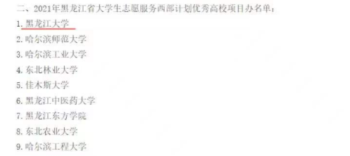 日前,黑龙江共青团公布2021年黑龙江省大学生志愿服务西部计划优秀项目办名单,按照西部计划全国项目办有关工作要求和我省实际,经各西部计划服务县和高校项目办自评,省项目办评估,我校获评“2021年黑龙江省大学生志愿服务西部计划优秀高校项目办”。