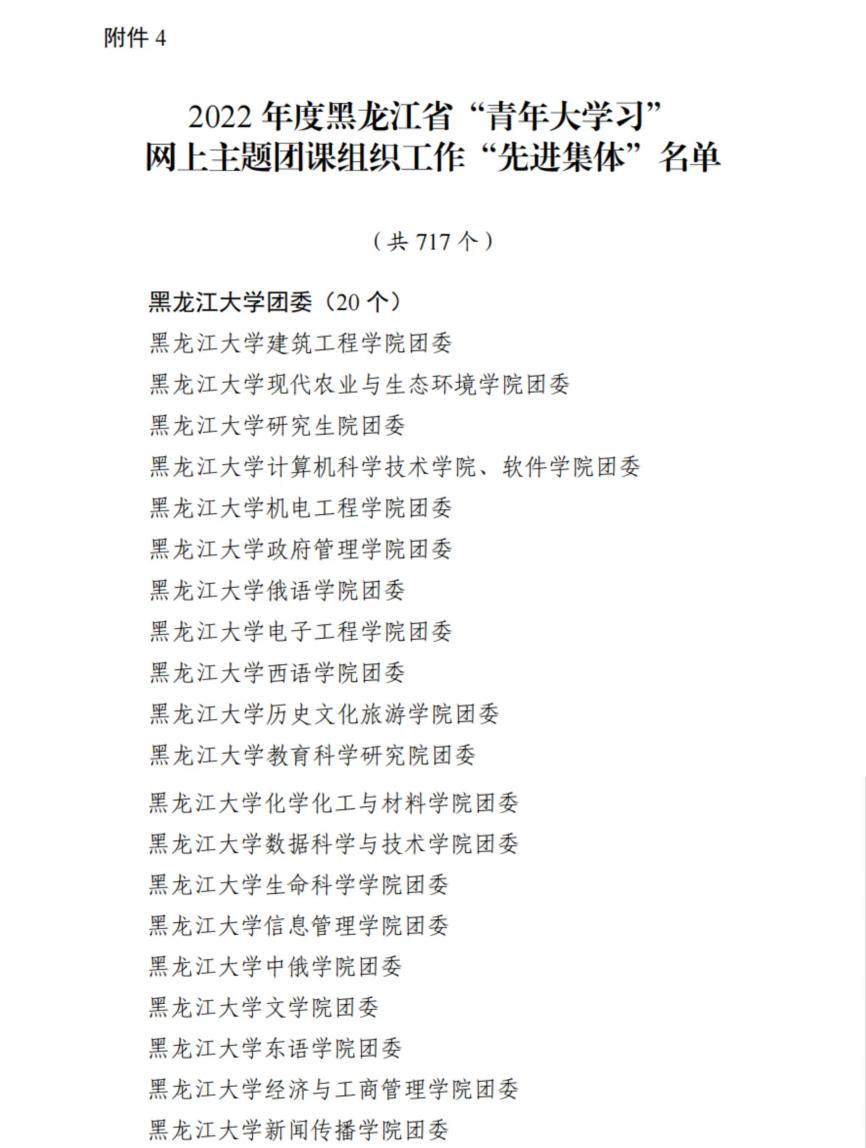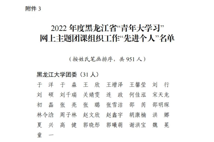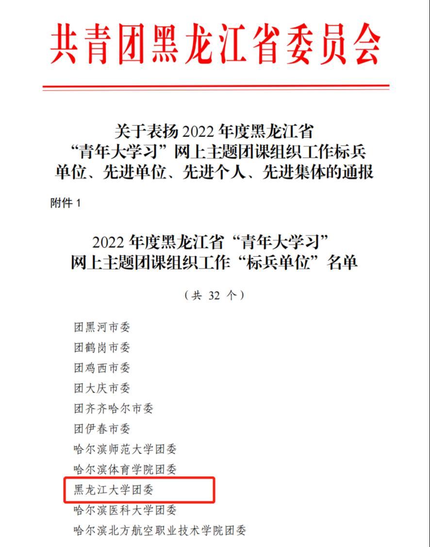 日前,由共青团黑龙江省委员会组织的“2022年度黑龙江省‘青年大学习’网上主题团课组织工作‘先进个人’、‘先进集体’评选”结果揭晓。我校团委荣获2022年度黑龙江省“青年大学习”网上主题团课组织工作“标兵单位”荣誉称号;我校建筑工程学院、现代农业与生态环境学院、研究生院等20个学院团委荣获“先进集体”荣誉称号;西语学院团委于洋老师、经济与工商管理学院学生夏兴等31名师生荣获“先进个人”荣誉称号。
