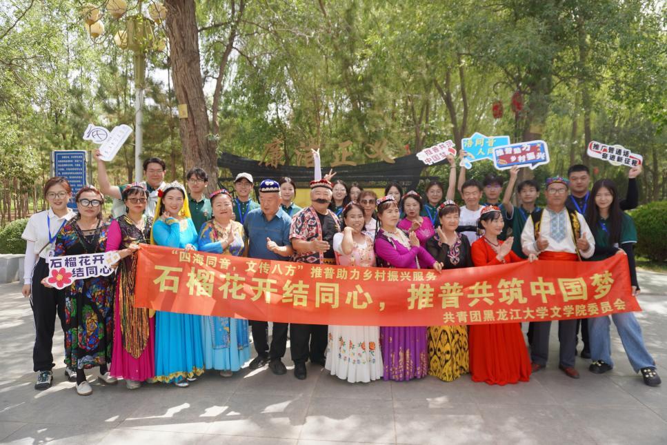 2024年暑期,文学院“四海同音 文传八方”推普助力乡村振兴志愿服务队以“石榴花开结同心,推普共筑中国梦”为主题,赴宁夏灵武开展社会实践。实践期间,团队在市民广场、商贸中心、农业园区等地开展访谈调研,累计发放推普宣传手册及调查问卷2000余份,有效增强了群众对普通话赋能乡村振兴的认同感。团队携手灵武市团委、教体局等单位开展“书信手拉手”心理健康帮扶活动,搭建各民族学生跨区域交流平台。紧扣“手机是新农具,直播是新农活”的乡村发展新业态,为兴唐米业等多家企业单位开展“普通话+”技能培训,系统提升企业员工及当地农户的直播营销水平,实现语言赋能与产业发展的有机融合。实践成果获新华社、中国青年报、中国教育电视台等10余家主流媒体报道,获教育部、团中央等单位的来信表扬。