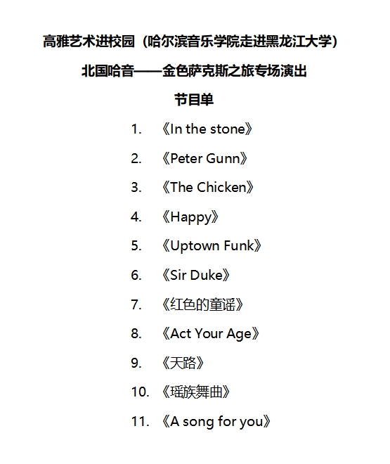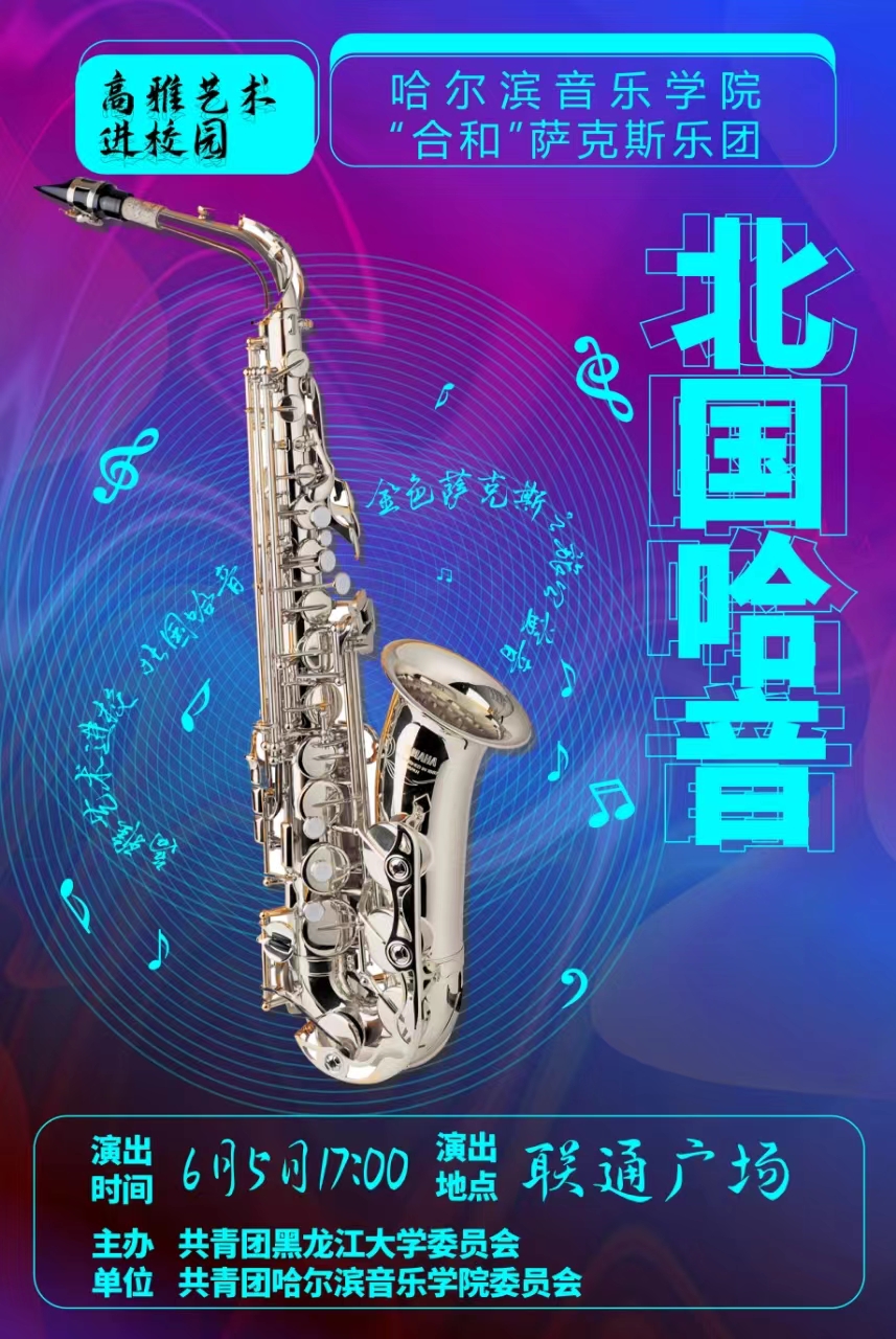 为全面加强和改进学校美育工作,切实提高学生审美和人文素养,以美育浸润学生,校团委特邀哈尔滨音乐学院举办高雅艺术进校园系列活动之北国哈音——金色萨克斯之旅专场演出。
