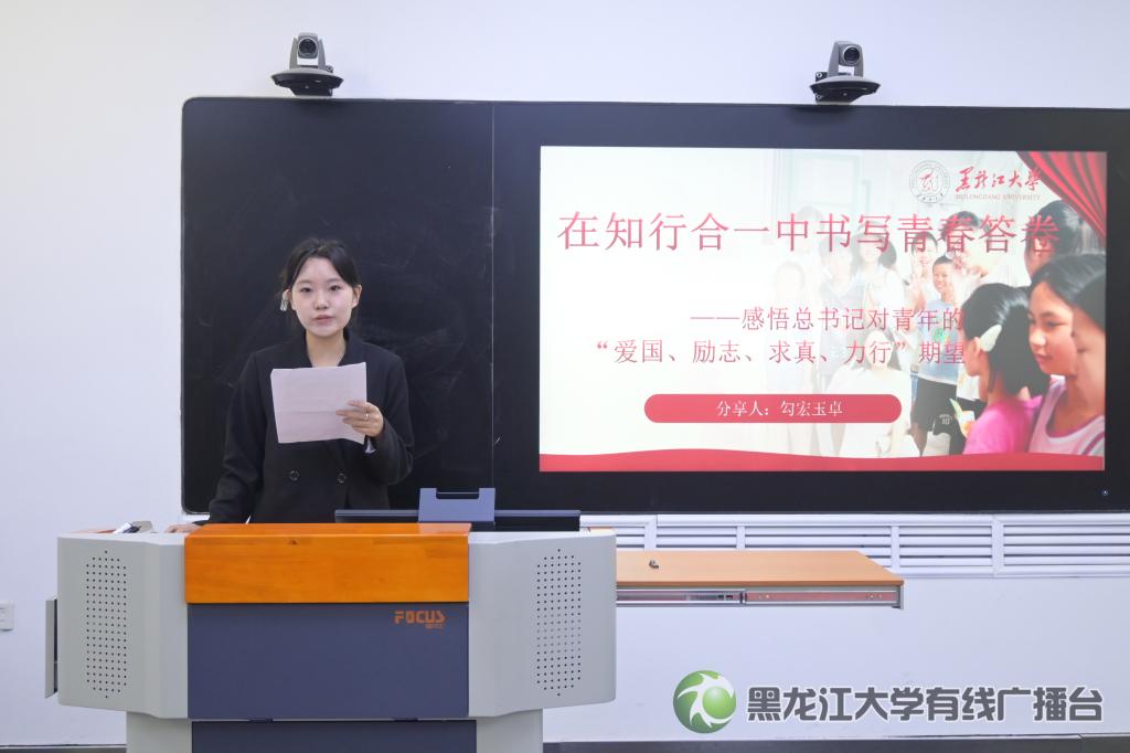 来自外国语言文学学院(区域国别学院)的于朕焮同学,从语言与文化的桥梁作用切入,分享了书中实干精神带来的启发。他结合自身支教经历谈到,青年要在行动中回答“爱国三问”,把“小我”融入“大我”。从走进大山播撒知识的种子、帮助农户解决农产品滞销,到推广普通话促进民族团结、教老人用智能手机提升生活便利,他深刻体会到语言和行动的力量。他认为,只有沉下心深耕语言功底,把“小我”的力量融入民族团结和文明互鉴的实践中,才能让青春在服务人民、奉献祖国的道路上熠熠生辉。