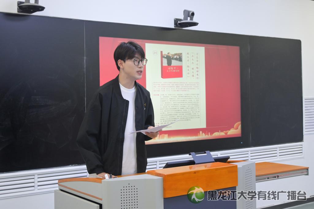 新闻传播学院的赵景瑞同学从四个维度阐释当代青年的使命担当:用支教诠释“立大志”,用服务体现“明大德”,用专业展示“成大才”,用实践明晰“担大任”。他提出,作为未来的传媒工作者,要善于运用融通中外的表达方式,讲好中国故事、传播好中国声音、阐发中国精神、展现中国风貌。