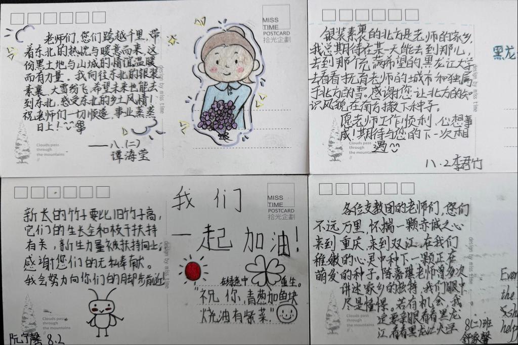 在潼南区双江镇初级中学,刘凤影一行深入校园,参观了解双江中学办学历史与特色展区,并与支教团成员深入交流,详细询问教学工作、生活保障及成长收获。在支教团授课班级,学生代表通过合唱黑龙江大学校歌《岁月如歌》、朗诵手写明信片、赠送感谢卡片表达对我校师生的敬意。随后,实地走访志愿者宿舍,了解日常住宿生活、课后备课情况,并送上毛毯等慰问品,传递学校的温暖关怀。刘凤影勉励支教团成员:“要以‘躬耕教坛’的初心扎根基层,用‘勤学笃行’的态度赋能成长,在乡村教育振兴中传承黑大精神、彰显黑大学子的使命担当。”