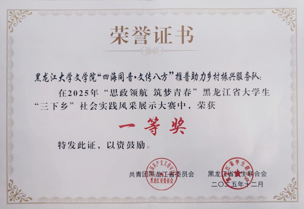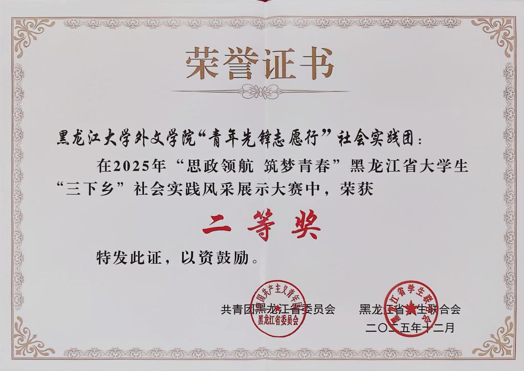 12月4日,2025年“思政领航 筑梦青春”黑龙江省大学生“三下乡”社会实践风采展示大赛圆满落幕。本次大赛由团省委、省学联组织开展,自9月启动以来,通过校地推荐、线上初评、线下决赛,我校文学院“四海同音·文传八方”推普助力乡村振兴服务队获一等奖,外国语言文学学院“青年先锋志愿行”社会实践团获二等奖。